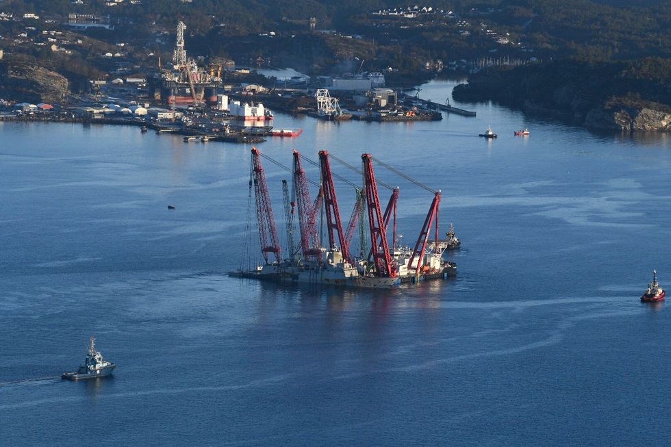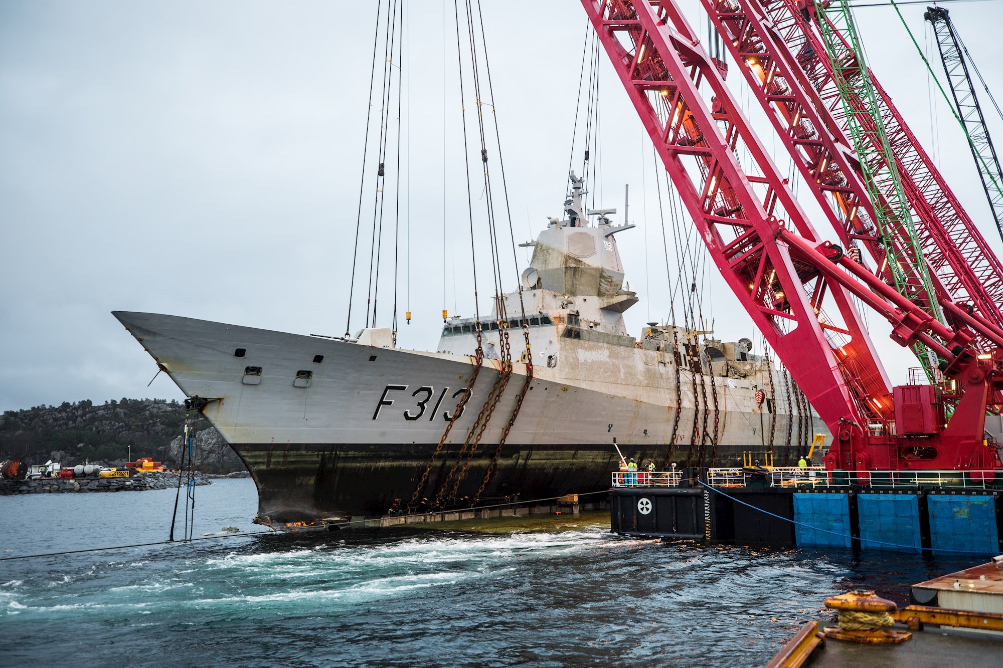 To lift the frigate safely and completely out of the water, it was transported while hanging from the crane hooks of the heavy lift vessels to the nearest port, where it was placed on a submersible pontoon. This partially submerged pontoon was subsequently de-ballasted, allowing it to re-emerge above the waterline while supporting the 'Helge Ingstad' at its centre. During this operation, the hoisting cranes stabilised the ship until all sea-fastenings had been secured for subsequent transport.