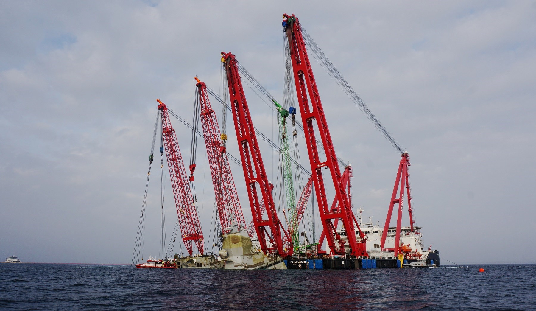 This made it possible to lift the 133-metre long and 5,500-tonne heavy frigate in one piece. In fact, the synchronous functioning of the four cranes allows to lift the wreck in one continuous operation and to move it into a horizontal position.