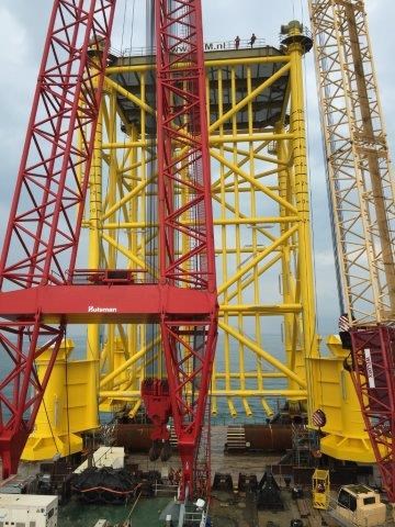 Operations included turning the jacket while it was suspended and partially submerged. After the 90 degrees rotation, the 1,000 tonne jacket structure was placed on the sea bottom, followed by the usual piling and grouting activities.
