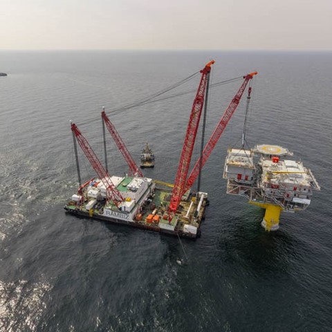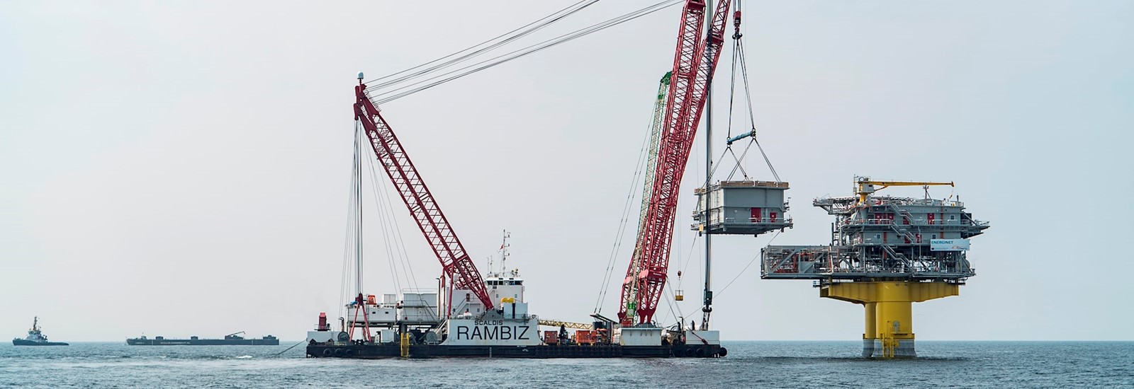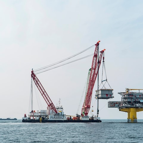 The KFBE substation was installed first and is the largest of the 2 substations. Its installation consisted of 2 separate lifts. First the KFB topside where after the KFE module was placed on top. The smaller KFA substation was installed shortly after, whereby all 3 lifts including allowance works were completed in only 2,5 days. Both installations were executed with HLV Rambiz.
