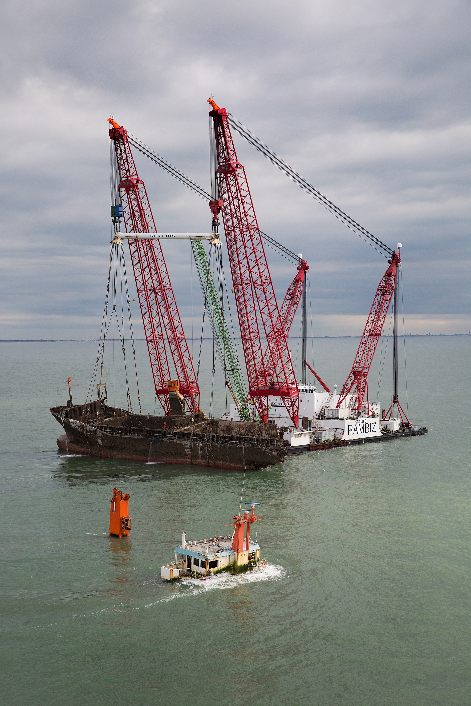 After being awarded the contract in April 2016, Scaldis immediately started the preparations and the mobilisation of the equipment to ensure a rapid response. Removing the cargo from the hold was the first step, whilst in parallel lifting chains were attached to the bow section of the Flinterstar. On 27th June 2016 all preparatory operations were finished and the lifting commenced. The lifting activities are progressing slowly as planned, due to the fact the water in the hold needs to be pumped out. Health, safety and environmental considerations are of paramount importance. During operations an oil containment vessel was active to capture the small amount of gas oil that was released. After the removal of the water, the bow has been placed on a bespoke pontoon ready for transport. Following seafastening of the bow section the pontoon will be towed to Ghent to be recycled. The stern of the ship is planned to be lifted and removed in August 2016.